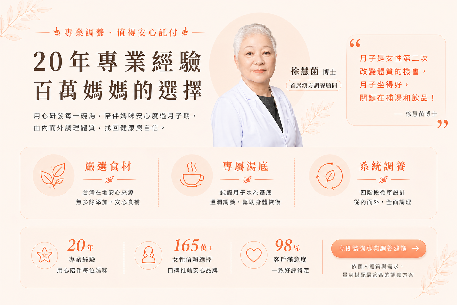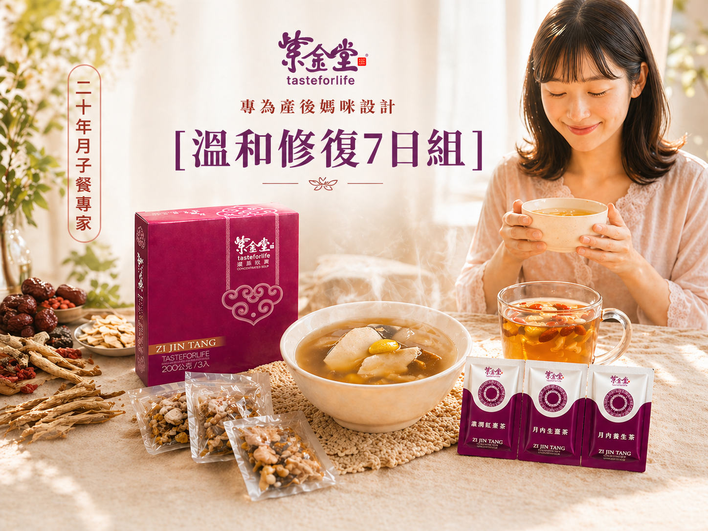 由中醫婦科權威徐慧茵博士專為產後媽咪研發設計,以藥膳食補結合功能型飲品為核心,幫助媽咪在坐月子期間真正恢復體力與體態。