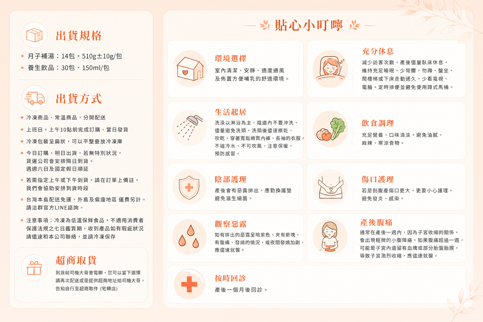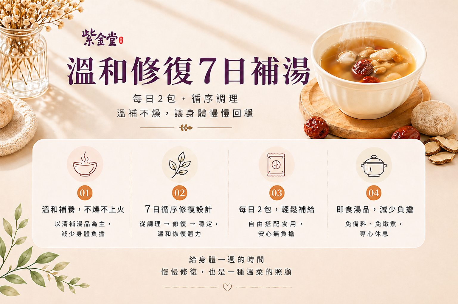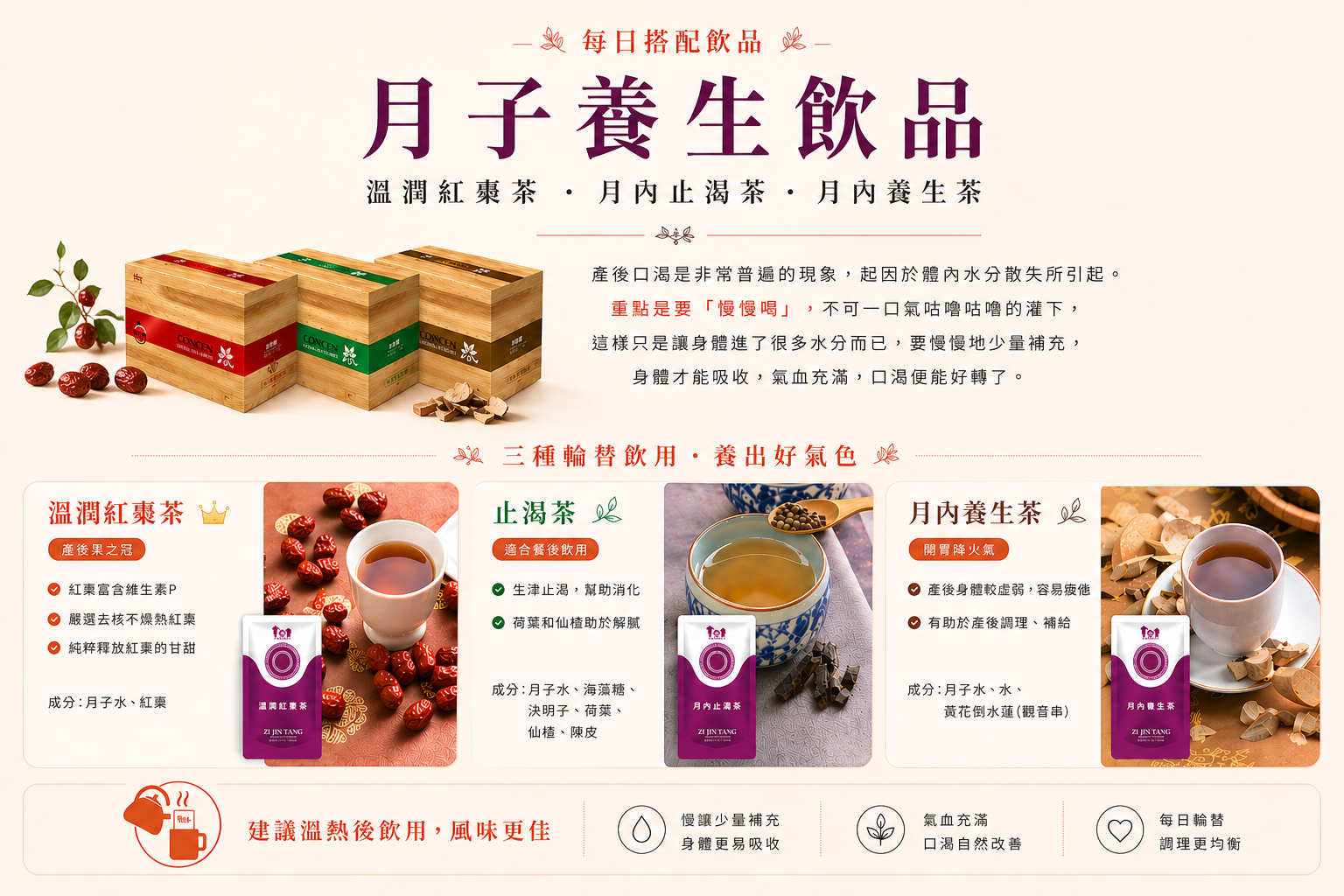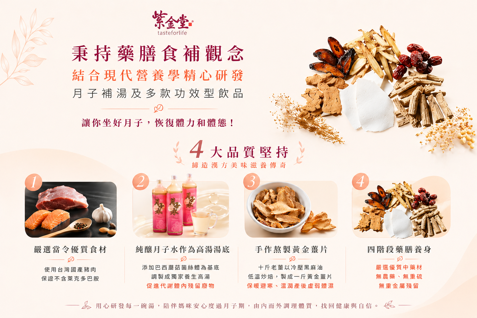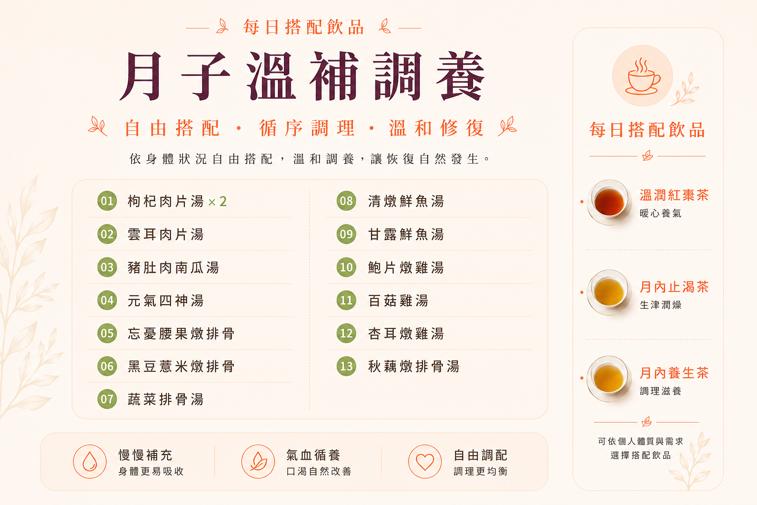 藥膳食補結合精心研發修護功能型飲品,讓月子補得紮實、補得安心。