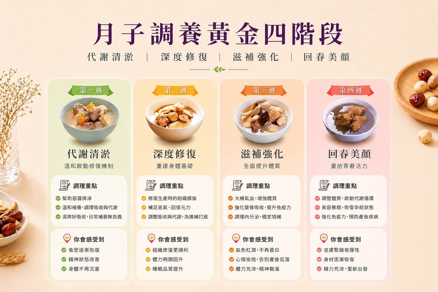 首創月子調養黃金四階段——代謝清淤、深度修復、滋補強化、回春美顏