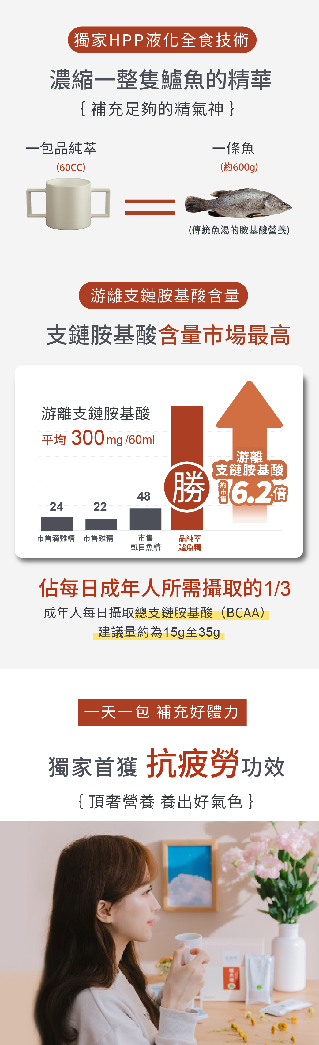 嚴選海水養殖產銷履歷認證優質鱸魚,採用液化全食專利技術以HPP超高壓低溫萃取,使整尾鱸魚由固體化成液體,並將蛋白質細化為最易於人體吸收的小分子胜肽及胺基酸,其中游離支鏈胺基酸高出市售同類型產品數倍。